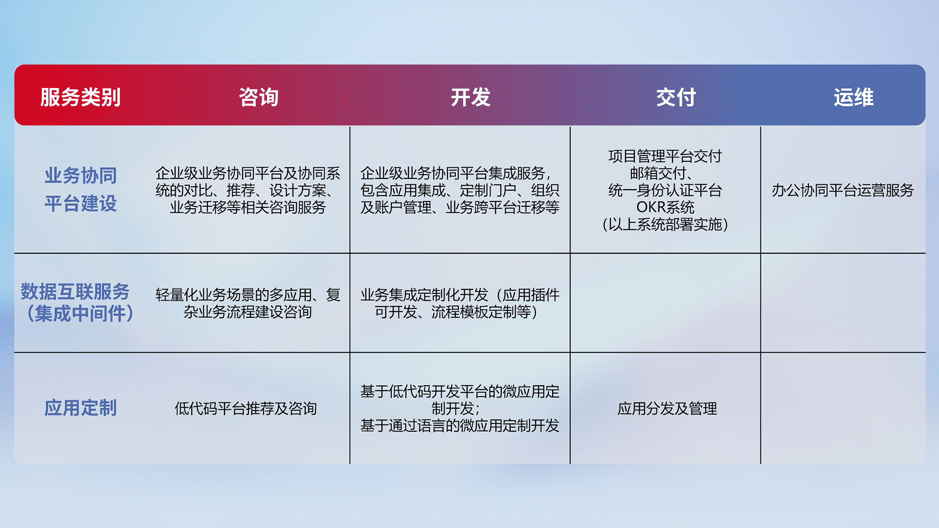 针对钉钉、、、、企微、、、IDaas等平台级产品提供产品的规划、、方案、、交付、、定制化开发等服务,,实现如统一协同办公、、智能客户服务、、混合会议管理、、智能数据查询、、、等业务场景,,,,实现数字化转型。。。